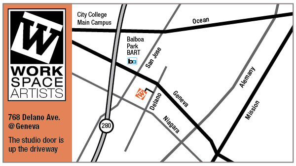 My open studio weekend will be held at Workspace Artists, a beautiful, sunlit, communal art space right next to the historic Geneva Car Barn building. Workplace Artists is located at 768 Delano Avenue, 1D (just walk up the driveway, and the warehouse is on your left). We will be open to the public on October 19th and 20th from 11AM to 6PM, both days. It's right next to the Balboa Park Bart and MUNI stations, and there's always plenty of street parking. Bring your friends, bring your family, bring your neighbors!